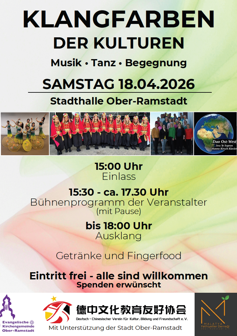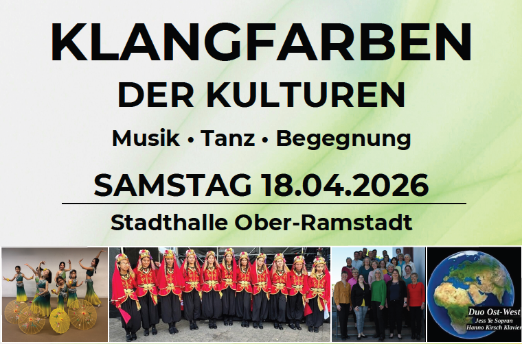 Am Samstag, 18. April 2026, lädt die Veranstaltung „Klangfarben der Kulturen“ zu einem inspirierenden Nachmittag voller Musik, Tanz und kultureller Begegnungen in die Stadthalle Ober-Ramstadt ein. (Mehr Info)
